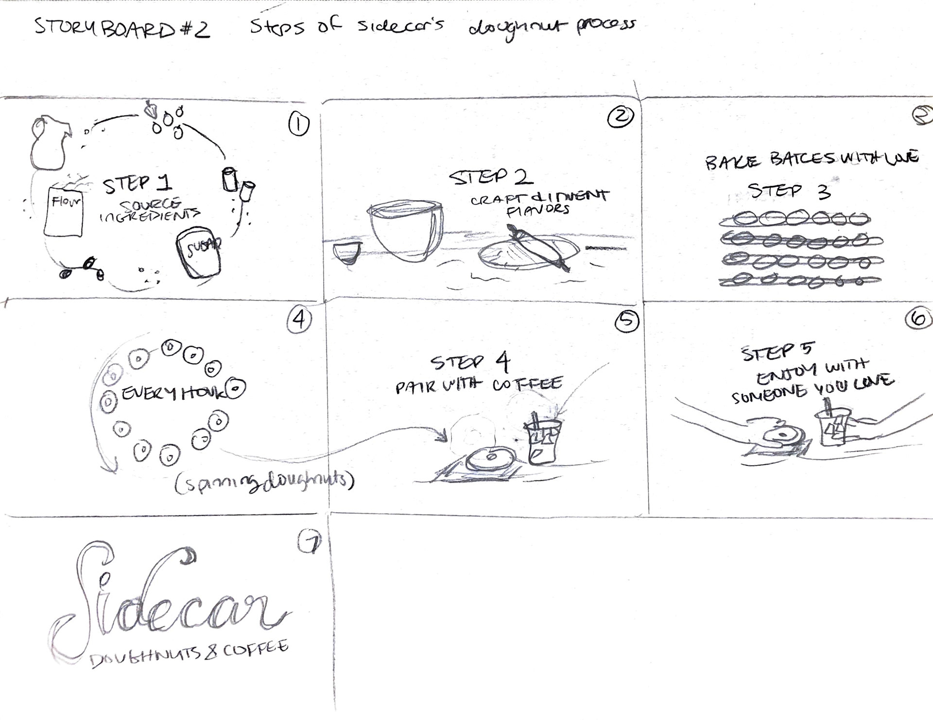 The prompt for this project was to animate a logo of any brand, telling a story that would promote their products or services. Having visited Sidecar many times, I have fallen in love with their doughnuts and their fun branding! Knowing I wanted to use them for this motion project, I researched their process in making the most delicious and freshest doughnuts. From there, I used each step in their process as a different frame in the animated storyboard. The goal was to illustrate and animate the ingredients and doughnuts in a way that gave them their own personality, bringing the audience into a brand story and giving them no choice but to crave a Huckleberry doughnut and iced latte!