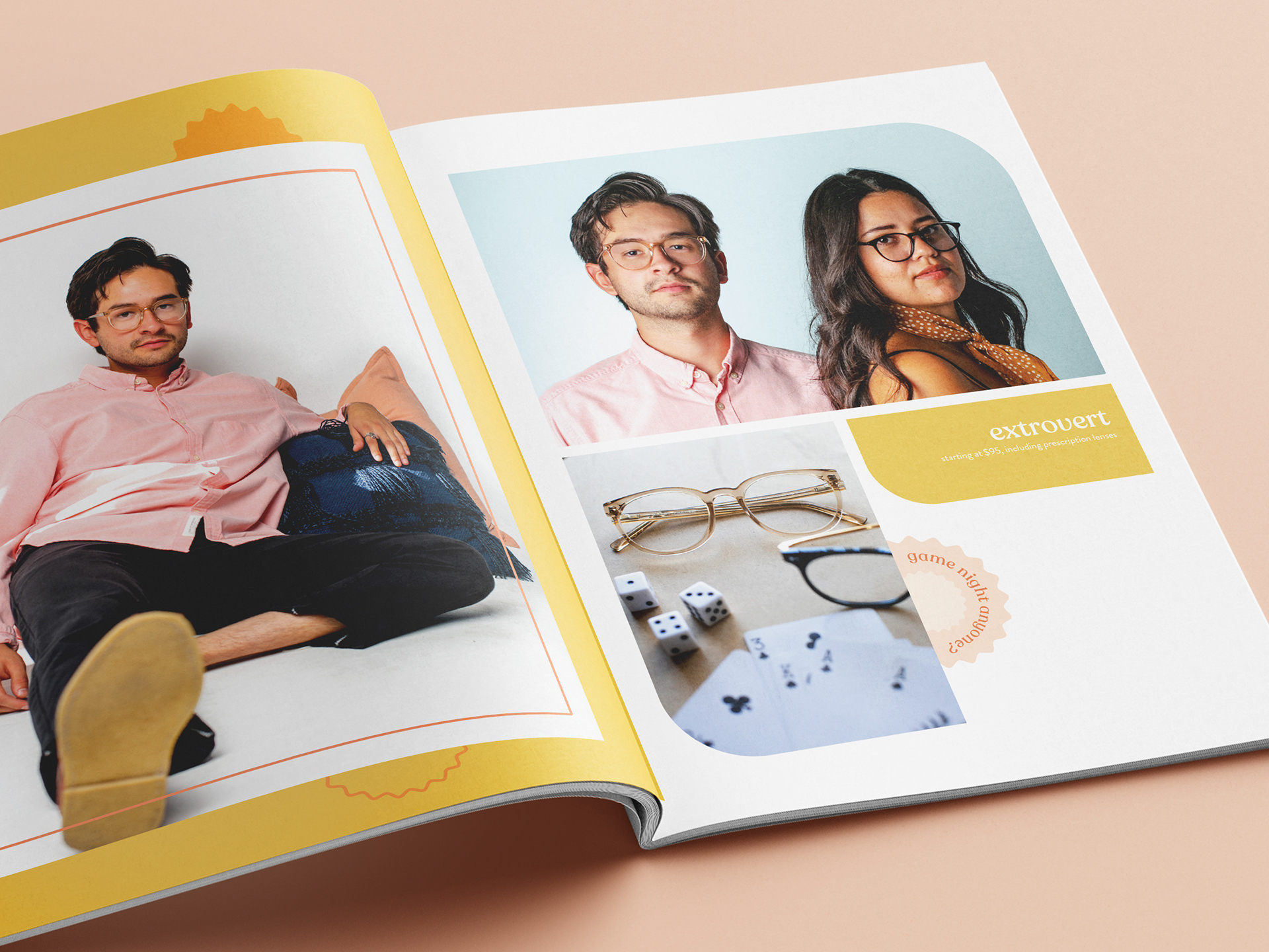 A deeper story started to form as I sketched a rough outline of the catalog, portraying the models moving out of isolation into community. An indoor studio shoot transitions from one to two people, and their world is slowly reframed. Shifting from a lifestyle in isolation and independence, an outdoor shoot of 5 friends depicts individuals framing their world outside of themselves, in community. Naturally an invitation is given at the end for readers to participate in Warby's "Buy a Pair, Give a Pair" program, and frame their world around others by giving new vision to those in need.